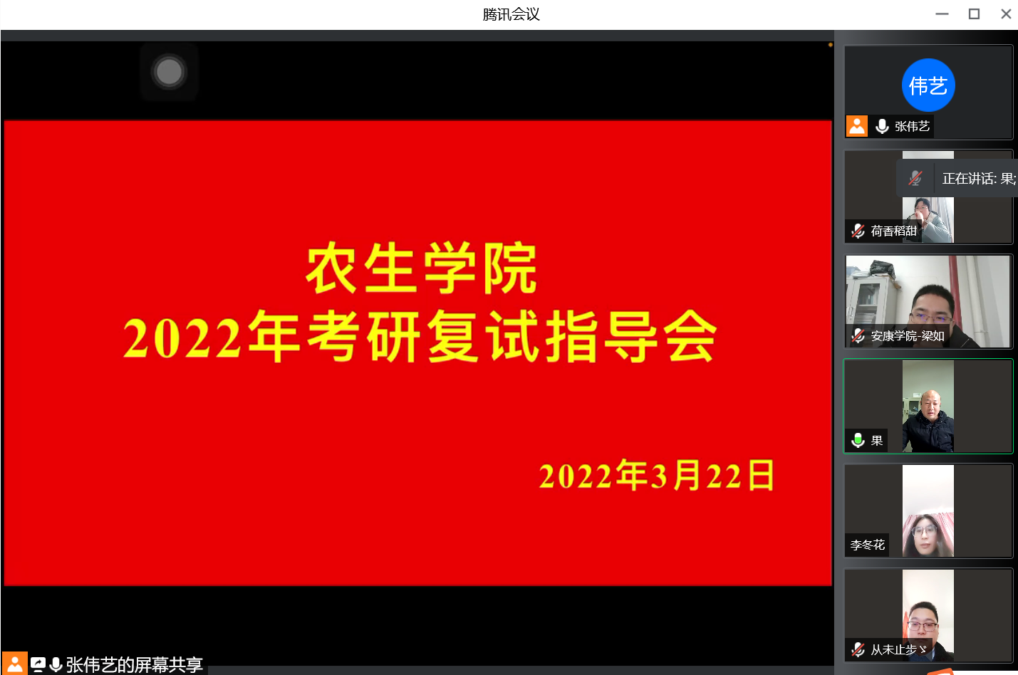 张伟艺老师介绍2022年公司考研初试情况,他回顾了员工考研过程中公司领导和老师们给予的重视和帮助指导,员工们坚定信心,刻苦努力,不负众望,有105人上线,达历年之最。食品系主任梁如结合当前疫情实际,为考研学子们分析了今年研考复试的严峻形势,要求员工要高度重视复试工作,做到合理选择,应上尽上。杨芳、梁如、张丽琼、李冬花、韩露露、王臣荣等教师结合自身多年经验,从网络设备调试、着装要求、心态调整等多个方面为考研复试学子分享了复试指导技巧,就复试重点问题详细说明。特别强调考研学子需要在复试前了解导师的研究方向、论文及其专著,多了解时事和本专业近几年的动态,对线上复试做好充足准备,多进行实战练习,做到淡定从容、充满自信。