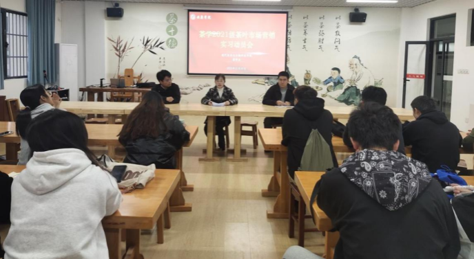 2023年11月10日上午,2021级茶学专业茶叶市场营销实习动员会在江北校区茶文化与茶艺室召开,会议由茶学教师程晓梅主持,吴冲、尹旭超和2021级全体员工参加。