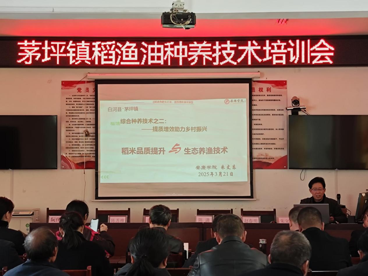朱文东教授围绕"稻渔油综合种养模式效益分析、稻米品质提升关键技术、生态养殖品种筛选与标准化管理、种养体系病虫害绿色防控技术、油菜绿肥高产种植技术"五大板块,对茅坪镇稻渔油循环农业发展路径进行专业指导与规范培训。
